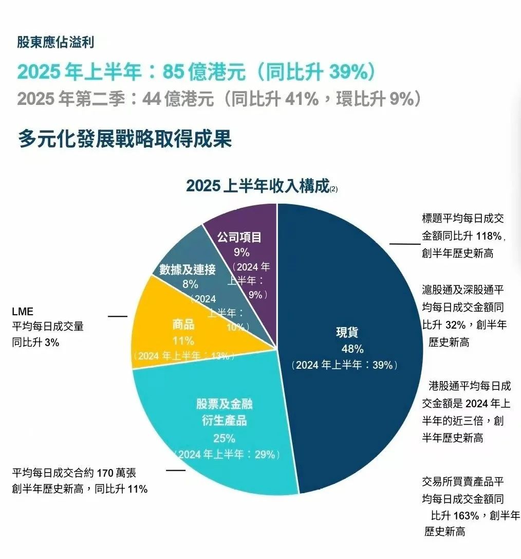 8月20日,港交所发布2025年中报,上半年已毕买卖收入(含其他收益)141亿港元,同比增长33%;主要业务收入130亿港元,同比增长32%;税后盈利85亿港元,同比增长39%。