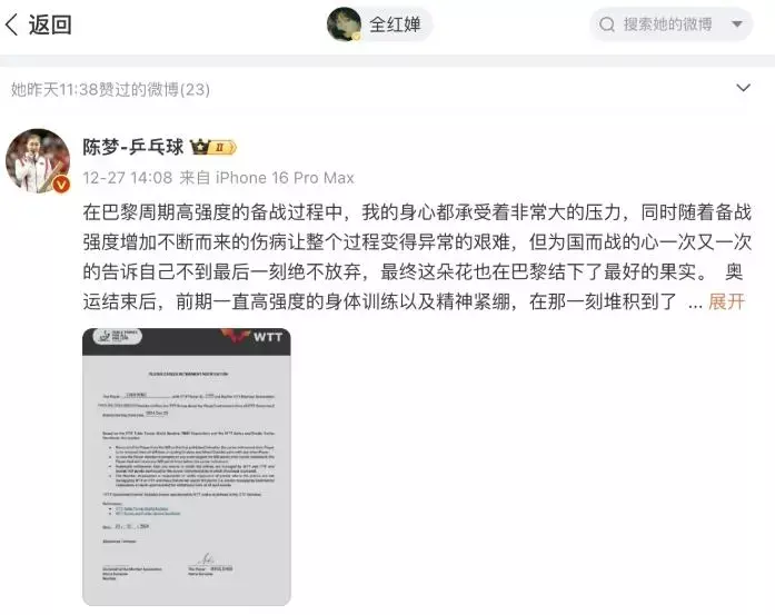 12月27日,樊振东和陈梦布告退出WTT宇宙排行,引发各界关注。有网友发现,奥运冠军潘展乐和全红婵也永诀给我方的好友在社媒上点赞。
